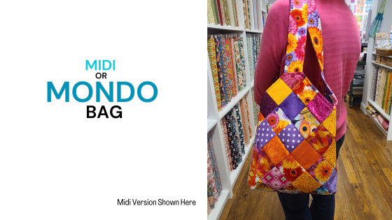The Mondo Bag bottom is approximately 10 inches square and the sides 17 inches high. The “Midi Bag” is a smaller version of the Mondo, with a square bottom approximately 8 inches and sides that are 12 inches high. The Mondo is great for carrying completed quilts to “Show and Tell” at guild meetings while the Midi is a great open top tote for knitting and portable crafts. Both are great for using up scraps, left over 5 and 10 inch coordinated squares and jelly roll strips.